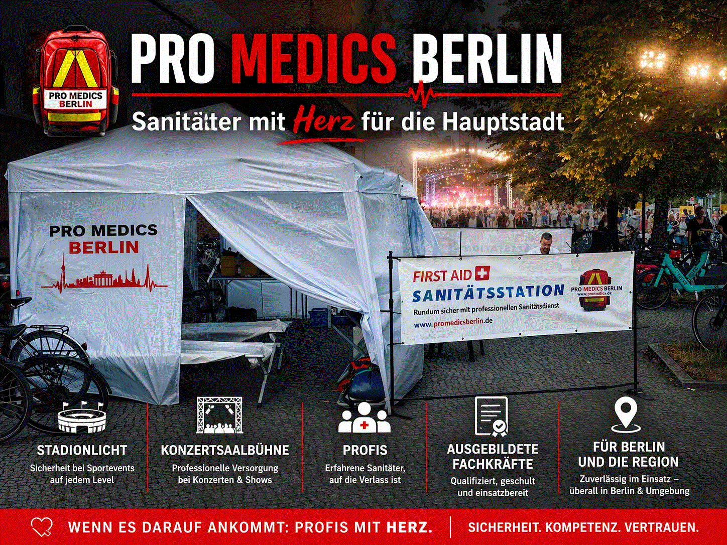 Bei PRO MEDICS BERLIN © beginnen wir jeden Einsatz mit einer detaillierten Risikoanalyse, die speziell auf die Art und Größe der Veranstaltung zugeschnitten ist.